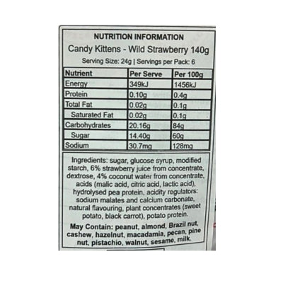 {"id":9894605685032,"title":"Candy Kittens Sweets - Wild Strawberry 140g","handle":"candy-kittens-sweets-wild-strawberry-140g","description":"\u003cp\u003e\u003c!--StartFragment--\u003e\u003c\/p\u003e\n\u003cp\u003e\u003c!--StartFragment--\u003e \u003c!--EndFragment--\u003e\u003c\/p\u003e\n\u003cp\u003e\u003c!--StartFragment--\u003eDescription\u003c!--EndFragment--\u003e\u003c\/p\u003e\n\u003cp\u003e140g. Ingredients: \u003c\/p\u003e\n\u003cp\u003eAllergen information: \u003c\/p\u003e\n\u003cp\u003e \u003c\/p\u003e","published_at":"2025-11-12T10:33:40+11:00","created_at":"2025-11-12T10:33:39+11:00","vendor":"Candy Kittens","type":"Food","tags":["Sweets","Sydney Store"],"price":925,"price_min":925,"price_max":925,"available":true,"price_varies":false,"compare_at_price":null,"compare_at_price_min":0,"compare_at_price_max":0,"compare_at_price_varies":false,"variants":[{"id":50929832788264,"title":"Default Title","option1":"Default Title","option2":null,"option3":null,"sku":"5060384262918","requires_shipping":true,"taxable":true,"featured_image":null,"available":true,"name":"Candy Kittens Sweets - Wild Strawberry 140g","public_title":null,"options":["Default Title"],"price":925,"weight":0,"compare_at_price":null,"inventory_quantity":20,"inventory_management":"shopify","inventory_policy":"deny","barcode":null,"requires_selling_plan":false,"selling_plan_allocations":[]}],"images":["\/\/crueltyfreeshop.myshopify.com\/cdn\/shop\/files\/CandyKittensWildStrawberry_6be4f336-1e97-4646-8fb7-a60fe7419d36.jpg?v=1763506167","\/\/crueltyfreeshop.myshopify.com\/cdn\/shop\/files\/candykittenstrawberry-NutritionalInfo.jpg?v=1763956939"],"featured_image":"\/\/crueltyfreeshop.myshopify.com\/cdn\/shop\/files\/CandyKittensWildStrawberry_6be4f336-1e97-4646-8fb7-a60fe7419d36.jpg?v=1763506167","options":["Title"],"media":[{"alt":null,"id":43006345543976,"position":1,"preview_image":{"aspect_ratio":1.0,"height":1600,"width":1600,"src":"\/\/crueltyfreeshop.myshopify.com\/cdn\/shop\/files\/CandyKittensWildStrawberry_6be4f336-1e97-4646-8fb7-a60fe7419d36.jpg?v=1763506167"},"aspect_ratio":1.0,"height":1600,"media_type":"image","src":"\/\/crueltyfreeshop.myshopify.com\/cdn\/shop\/files\/CandyKittensWildStrawberry_6be4f336-1e97-4646-8fb7-a60fe7419d36.jpg?v=1763506167","width":1600},{"alt":null,"id":43044257726760,"position":2,"preview_image":{"aspect_ratio":1.0,"height":400,"width":400,"src":"\/\/crueltyfreeshop.myshopify.com\/cdn\/shop\/files\/candykittenstrawberry-NutritionalInfo.jpg?v=1763956939"},"aspect_ratio":1.0,"height":400,"media_type":"image","src":"\/\/crueltyfreeshop.myshopify.com\/cdn\/shop\/files\/candykittenstrawberry-NutritionalInfo.jpg?v=1763956939","width":400}],"requires_selling_plan":false,"selling_plan_groups":[],"content":"\u003cp\u003e\u003c!--StartFragment--\u003e\u003c\/p\u003e\n\u003cp\u003e\u003c!--StartFragment--\u003e \u003c!--EndFragment--\u003e\u003c\/p\u003e\n\u003cp\u003e\u003c!--StartFragment--\u003eDescription\u003c!--EndFragment--\u003e\u003c\/p\u003e\n\u003cp\u003e140g. Ingredients: \u003c\/p\u003e\n\u003cp\u003eAllergen information: \u003c\/p\u003e\n\u003cp\u003e \u003c\/p\u003e"}