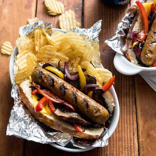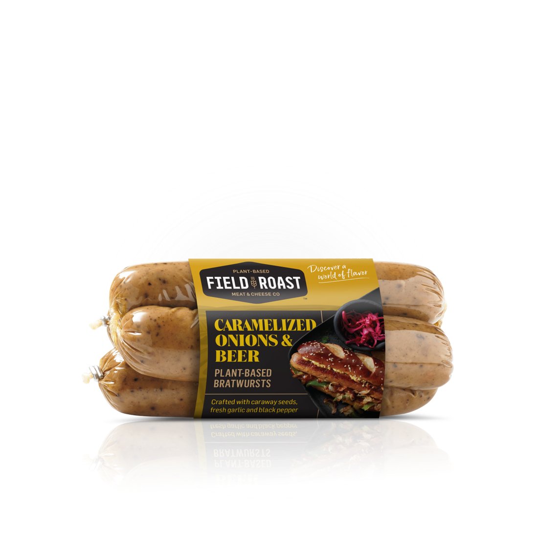 362g. Ingredients: Vital wheat gluten, beer (filtered water, wheat, malted barley, hops), filtered water, caramelized onions (yellow onion, cane sugar, apple juice concentrate), expeller pressed safflower oil, organic expeller pressed palm fruit oil, yeast extract, garlic, pea protein, barley malt extract, onion powder, granulated garlic, spices, cultured cane sugar, vinegar, sea salt, caraway, red pepper, black pepper.