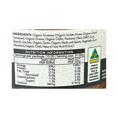 {"id":8750679261480,"title":"Ozganics Organic Salsa Medium 310g","handle":"ozganics-medium-salsa-310g","description":"\u003cdiv class=\"page\" title=\"Page 19\"\u003e\n\u003cdiv class=\"section\"\u003e\n\u003cdiv class=\"layoutArea\"\u003e\n\u003cdiv class=\"column\"\u003e\n\u003cdiv class=\"page\" title=\"Page 19\"\u003e\n\u003cdiv class=\"section\"\u003e\n\u003cdiv class=\"layoutArea\"\u003e\n\u003cdiv class=\"column\"\u003e\n\u003cp\u003eMade with 100% Australian organic tomatoes, and with no added sugar, our Medium Salsa is the perfect accompaniment for a bowl of chips, some cheesy nachos or around the table on Taco Tuesday!\u003c\/p\u003e\n\u003cp\u003eOzganics Medium Salsa is enhanced with the full bodied natural sweetness of ripe plump organic tomatoes and with no added sugar, it tops the charts for Australia's most popular salsa blend.\u003c\/p\u003e\n\u003ch5\u003eReviews\u003c\/h5\u003e\n\u003cp\u003eReviews go here\u003c\/p\u003e\n\u003ch5\u003eIngredients\u003c\/h5\u003e\n\u003cp\u003eAny images, tags, filters, product categories, and any other information on this website showing ingredients, nutrition panels, or allergy statements are for guidance only, as manufacturers often change their formulations without notice. Please contact the manufacturer for the most up-to-date ingredient information, or email us to confirm the ingredients of the stock currently on hand.\u003c\/p\u003e\n\u003c\/div\u003e\n\u003c\/div\u003e\n\u003c\/div\u003e\n\u003c\/div\u003e\n\u003c\/div\u003e\n\u003c\/div\u003e\n\u003c\/div\u003e\n\u003c\/div\u003e\n\u003c!-- TABS --\u003e\u003c!-- \/TABS --\u003e","published_at":"2025-07-16T15:04:11+10:00","created_at":"2023-11-01T18:04:34+11:00","vendor":"Ozganics","type":"Food (GST Free)","tags":["Salsa","Sydney Store"],"price":610,"price_min":610,"price_max":610,"available":true,"price_varies":false,"compare_at_price":null,"compare_at_price_min":0,"compare_at_price_max":0,"compare_at_price_varies":false,"variants":[{"id":47074470920488,"title":"Default Title","option1":"Default Title","option2":null,"option3":null,"sku":"9327304001245","requires_shipping":true,"taxable":false,"featured_image":null,"available":true,"name":"Ozganics Organic Salsa Medium 310g","public_title":null,"options":["Default Title"],"price":610,"weight":350,"compare_at_price":null,"inventory_quantity":9,"inventory_management":"shopify","inventory_policy":"deny","barcode":null,"requires_selling_plan":false,"selling_plan_allocations":[]}],"images":["\/\/crueltyfreeshop.myshopify.com\/cdn\/shop\/files\/Medium_Salsa_Square.webp?v=1698822445","\/\/crueltyfreeshop.myshopify.com\/cdn\/shop\/files\/OzganicSalsa-NutritionalInformation.jpg?v=1764731196"],"featured_image":"\/\/crueltyfreeshop.myshopify.com\/cdn\/shop\/files\/Medium_Salsa_Square.webp?v=1698822445","options":["Title"],"media":[{"alt":null,"id":36789059617064,"position":1,"preview_image":{"aspect_ratio":1.0,"height":700,"width":700,"src":"\/\/crueltyfreeshop.myshopify.com\/cdn\/shop\/files\/Medium_Salsa_Square.webp?v=1698822445"},"aspect_ratio":1.0,"height":700,"media_type":"image","src":"\/\/crueltyfreeshop.myshopify.com\/cdn\/shop\/files\/Medium_Salsa_Square.webp?v=1698822445","width":700},{"alt":null,"id":43121820827944,"position":2,"preview_image":{"aspect_ratio":1.0,"height":400,"width":400,"src":"\/\/crueltyfreeshop.myshopify.com\/cdn\/shop\/files\/OzganicSalsa-NutritionalInformation.jpg?v=1764731196"},"aspect_ratio":1.0,"height":400,"media_type":"image","src":"\/\/crueltyfreeshop.myshopify.com\/cdn\/shop\/files\/OzganicSalsa-NutritionalInformation.jpg?v=1764731196","width":400}],"requires_selling_plan":false,"selling_plan_groups":[],"content":"\u003cdiv class=\"page\" title=\"Page 19\"\u003e\n\u003cdiv class=\"section\"\u003e\n\u003cdiv class=\"layoutArea\"\u003e\n\u003cdiv class=\"column\"\u003e\n\u003cdiv class=\"page\" title=\"Page 19\"\u003e\n\u003cdiv class=\"section\"\u003e\n\u003cdiv class=\"layoutArea\"\u003e\n\u003cdiv class=\"column\"\u003e\n\u003cp\u003eMade with 100% Australian organic tomatoes, and with no added sugar, our Medium Salsa is the perfect accompaniment for a bowl of chips, some cheesy nachos or around the table on Taco Tuesday!\u003c\/p\u003e\n\u003cp\u003eOzganics Medium Salsa is enhanced with the full bodied natural sweetness of ripe plump organic tomatoes and with no added sugar, it tops the charts for Australia's most popular salsa blend.\u003c\/p\u003e\n\u003ch5\u003eReviews\u003c\/h5\u003e\n\u003cp\u003eReviews go here\u003c\/p\u003e\n\u003ch5\u003eIngredients\u003c\/h5\u003e\n\u003cp\u003eAny images, tags, filters, product categories, and any other information on this website showing ingredients, nutrition panels, or allergy statements are for guidance only, as manufacturers often change their formulations without notice. Please contact the manufacturer for the most up-to-date ingredient information, or email us to confirm the ingredients of the stock currently on hand.\u003c\/p\u003e\n\u003c\/div\u003e\n\u003c\/div\u003e\n\u003c\/div\u003e\n\u003c\/div\u003e\n\u003c\/div\u003e\n\u003c\/div\u003e\n\u003c\/div\u003e\n\u003c\/div\u003e\n\u003c!-- TABS --\u003e\u003c!-- \/TABS --\u003e"}