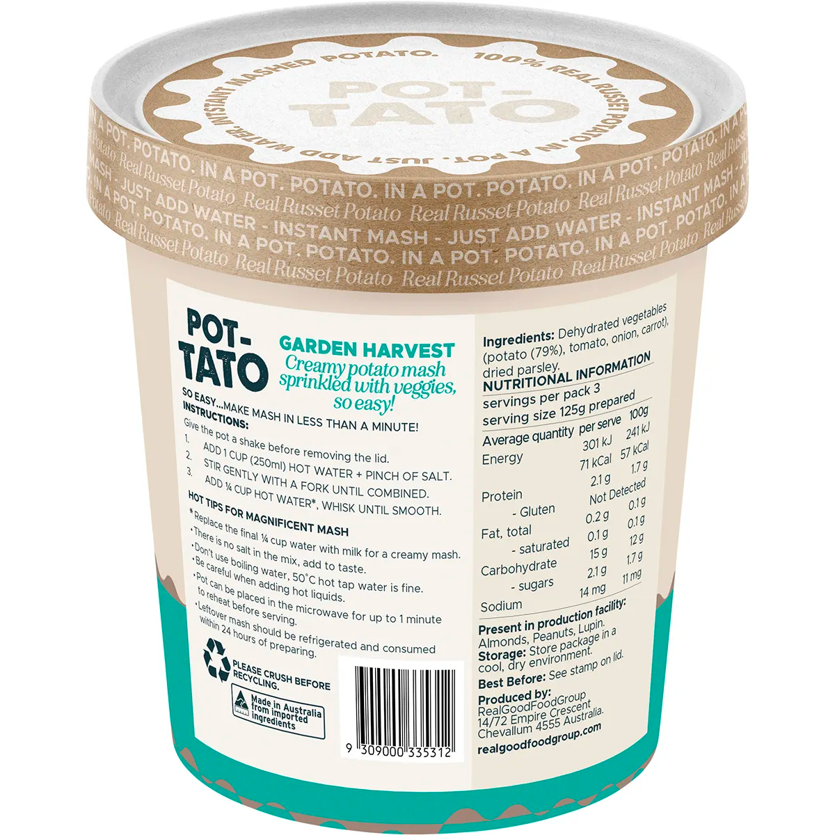{"id":8750582399272,"title":"Pot-Tato Instant Mashed Potato Cup - Garden Harvest 63g","handle":"pot-tato-instant-mashed-potato-cup-garden-harvest-63g-case-10","description":"\u003cp\u003e\u003cspan\u003eCreamy potato mash sprinkled with veggies in a pot - so easy and quick. Made from 100% real russet potatos. No cooking needed, just add water. Makes 350g of mashed potato.\u003c\/span\u003e\u003c\/p\u003e\n\u003c!-- TABS --\u003e\n\u003ch5\u003eReviews\u003c\/h5\u003e\n\u003cp\u003eReviews go here\u003c\/p\u003e\n\u003ch5\u003eIngredients\u003c\/h5\u003e\n\u003cp\u003eAny images, tags, filters, product categories, and any other information on this website showing ingredients, nutrition panels, or allergy statements are for guidance only, as manufacturers often change their formulations without notice. Please contact the manufacturer for the most up-to-date ingredient information, or email us to confirm the ingredients of the stock currently on hand.\u003c\/p\u003e\n\u003c!-- \/TABS --\u003e","published_at":"2023-11-08T16:21:03+11:00","created_at":"2023-11-01T13:13:00+11:00","vendor":"Purely Potato","type":"Food (GST Free)","tags":["Instant Meals","Sydney Store"],"price":490,"price_min":490,"price_max":490,"available":true,"price_varies":false,"compare_at_price":null,"compare_at_price_min":0,"compare_at_price_max":0,"compare_at_price_varies":false,"variants":[{"id":47073725055272,"title":"Default Title","option1":"Default Title","option2":null,"option3":null,"sku":"9309000335312","requires_shipping":true,"taxable":false,"featured_image":null,"available":true,"name":"Pot-Tato Instant Mashed Potato Cup - Garden Harvest 63g","public_title":null,"options":["Default Title"],"price":490,"weight":60,"compare_at_price":null,"inventory_quantity":7,"inventory_management":"shopify","inventory_policy":"deny","barcode":null,"requires_selling_plan":false,"selling_plan_allocations":[]}],"images":["\/\/crueltyfreeshop.myshopify.com\/cdn\/shop\/files\/potgarden.png?v=1698816556","\/\/crueltyfreeshop.myshopify.com\/cdn\/shop\/files\/potgardenback.png?v=1698816556","\/\/crueltyfreeshop.myshopify.com\/cdn\/shop\/files\/pot-tato-NutritionalInformation.jpg?v=1764637299"],"featured_image":"\/\/crueltyfreeshop.myshopify.com\/cdn\/shop\/files\/potgarden.png?v=1698816556","options":["Title"],"media":[{"alt":null,"id":36788821754152,"position":1,"preview_image":{"aspect_ratio":1.0,"height":1200,"width":1200,"src":"\/\/crueltyfreeshop.myshopify.com\/cdn\/shop\/files\/potgarden.png?v=1698816556"},"aspect_ratio":1.0,"height":1200,"media_type":"image","src":"\/\/crueltyfreeshop.myshopify.com\/cdn\/shop\/files\/potgarden.png?v=1698816556","width":1200},{"alt":null,"id":36788821721384,"position":2,"preview_image":{"aspect_ratio":1.0,"height":1200,"width":1200,"src":"\/\/crueltyfreeshop.myshopify.com\/cdn\/shop\/files\/potgardenback.png?v=1698816556"},"aspect_ratio":1.0,"height":1200,"media_type":"image","src":"\/\/crueltyfreeshop.myshopify.com\/cdn\/shop\/files\/potgardenback.png?v=1698816556","width":1200},{"alt":null,"id":43116340445480,"position":3,"preview_image":{"aspect_ratio":1.0,"height":400,"width":400,"src":"\/\/crueltyfreeshop.myshopify.com\/cdn\/shop\/files\/pot-tato-NutritionalInformation.jpg?v=1764637299"},"aspect_ratio":1.0,"height":400,"media_type":"image","src":"\/\/crueltyfreeshop.myshopify.com\/cdn\/shop\/files\/pot-tato-NutritionalInformation.jpg?v=1764637299","width":400}],"requires_selling_plan":false,"selling_plan_groups":[],"content":"\u003cp\u003e\u003cspan\u003eCreamy potato mash sprinkled with veggies in a pot - so easy and quick. Made from 100% real russet potatos. No cooking needed, just add water. Makes 350g of mashed potato.\u003c\/span\u003e\u003c\/p\u003e\n\u003c!-- TABS --\u003e\n\u003ch5\u003eReviews\u003c\/h5\u003e\n\u003cp\u003eReviews go here\u003c\/p\u003e\n\u003ch5\u003eIngredients\u003c\/h5\u003e\n\u003cp\u003eAny images, tags, filters, product categories, and any other information on this website showing ingredients, nutrition panels, or allergy statements are for guidance only, as manufacturers often change their formulations without notice. Please contact the manufacturer for the most up-to-date ingredient information, or email us to confirm the ingredients of the stock currently on hand.\u003c\/p\u003e\n\u003c!-- \/TABS --\u003e"}