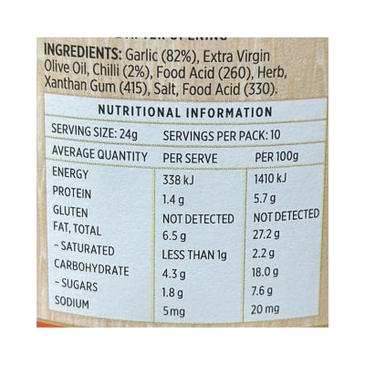 {"id":9488081486120,"title":"Riverina Grove - Crushed Garlic Chilli 240g","handle":"riverina-grove-crushed-garlic-chilli-240g","description":"\u003cp\u003e \u003c\/p\u003e\n\u003ch5\u003eReviews\u003c\/h5\u003e\n\u003cp\u003eReviews go here\u003c\/p\u003e\n\u003ch5\u003eIngredients\u003c\/h5\u003e\n\u003cp\u003eAny images, tags, filters, product categories, and any other information on this website showing ingredients, nutrition panels, or allergy statements are for guidance only, as manufacturers often change their formulations without notice. Please contact the manufacturer for the most up-to-date ingredient information, or email us to confirm the ingredients of the stock currently on hand.\u003c\/p\u003e","published_at":"2025-11-21T14:27:20+11:00","created_at":"2024-11-08T09:35:28+11:00","vendor":"Riverina Grove","type":"General","tags":["Cooking Pastes","Sydney Store"],"price":480,"price_min":480,"price_max":480,"available":true,"price_varies":false,"compare_at_price":null,"compare_at_price_min":0,"compare_at_price_max":0,"compare_at_price_varies":false,"variants":[{"id":49490588631336,"title":"Default Title","option1":"Default Title","option2":null,"option3":null,"sku":"9326142000120","requires_shipping":true,"taxable":false,"featured_image":null,"available":true,"name":"Riverina Grove - Crushed Garlic Chilli 240g","public_title":null,"options":["Default Title"],"price":480,"weight":0,"compare_at_price":null,"inventory_quantity":3,"inventory_management":"shopify","inventory_policy":"deny","barcode":null,"requires_selling_plan":false,"selling_plan_allocations":[]}],"images":["\/\/crueltyfreeshop.myshopify.com\/cdn\/shop\/files\/RG_Herbs_GarlicChilli_240g_web.jpg?v=1731018928","\/\/crueltyfreeshop.myshopify.com\/cdn\/shop\/files\/RiverinaGroveGarlicChilli-NutritionalInformation.jpg?v=1764818287"],"featured_image":"\/\/crueltyfreeshop.myshopify.com\/cdn\/shop\/files\/RG_Herbs_GarlicChilli_240g_web.jpg?v=1731018928","options":["Title"],"media":[{"alt":null,"id":40439766253864,"position":1,"preview_image":{"aspect_ratio":1.0,"height":2048,"width":2048,"src":"\/\/crueltyfreeshop.myshopify.com\/cdn\/shop\/files\/RG_Herbs_GarlicChilli_240g_web.jpg?v=1731018928"},"aspect_ratio":1.0,"height":2048,"media_type":"image","src":"\/\/crueltyfreeshop.myshopify.com\/cdn\/shop\/files\/RG_Herbs_GarlicChilli_240g_web.jpg?v=1731018928","width":2048},{"alt":null,"id":43127619617064,"position":2,"preview_image":{"aspect_ratio":1.0,"height":400,"width":400,"src":"\/\/crueltyfreeshop.myshopify.com\/cdn\/shop\/files\/RiverinaGroveGarlicChilli-NutritionalInformation.jpg?v=1764818287"},"aspect_ratio":1.0,"height":400,"media_type":"image","src":"\/\/crueltyfreeshop.myshopify.com\/cdn\/shop\/files\/RiverinaGroveGarlicChilli-NutritionalInformation.jpg?v=1764818287","width":400}],"requires_selling_plan":false,"selling_plan_groups":[],"content":"\u003cp\u003e \u003c\/p\u003e\n\u003ch5\u003eReviews\u003c\/h5\u003e\n\u003cp\u003eReviews go here\u003c\/p\u003e\n\u003ch5\u003eIngredients\u003c\/h5\u003e\n\u003cp\u003eAny images, tags, filters, product categories, and any other information on this website showing ingredients, nutrition panels, or allergy statements are for guidance only, as manufacturers often change their formulations without notice. Please contact the manufacturer for the most up-to-date ingredient information, or email us to confirm the ingredients of the stock currently on hand.\u003c\/p\u003e"}