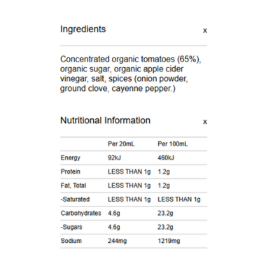{"id":9486874214696,"title":"Spiral Foods Ketchup - Tomato Organic 300ml","handle":"spiral-foods-ketchup-tomato-organic-300ml","description":"\u003cp\u003e \u003c\/p\u003e\n\u003ch5\u003eReviews\u003c\/h5\u003e\n\u003cp\u003eReviews go here\u003c\/p\u003e\n\u003ch5\u003eIngredients\u003c\/h5\u003e\n\u003cp\u003eAny images, tags, filters, product categories, and any other information on this website showing ingredients, nutrition panels, or allergy statements are for guidance only, as manufacturers often change their formulations without notice. Please contact the manufacturer for the most up-to-date ingredient information, or email us to confirm the ingredients of the stock currently on hand.\u003c\/p\u003e","published_at":"2025-03-05T12:37:17+11:00","created_at":"2024-11-07T16:05:55+11:00","vendor":"Spiral Foods","type":"General","tags":["Savoury Sauces","Sydney Store"],"price":673,"price_min":673,"price_max":673,"available":true,"price_varies":false,"compare_at_price":null,"compare_at_price_min":0,"compare_at_price_max":0,"compare_at_price_varies":false,"variants":[{"id":49487022620968,"title":"Default Title","option1":"Default Title","option2":null,"option3":null,"sku":"9312336791073","requires_shipping":true,"taxable":false,"featured_image":null,"available":true,"name":"Spiral Foods Ketchup - Tomato Organic 300ml","public_title":null,"options":["Default Title"],"price":673,"weight":0,"compare_at_price":null,"inventory_quantity":4,"inventory_management":"shopify","inventory_policy":"deny","barcode":null,"requires_selling_plan":false,"selling_plan_allocations":[]}],"images":["\/\/crueltyfreeshop.myshopify.com\/cdn\/shop\/files\/9312336791059.jpg?v=1730955956","\/\/crueltyfreeshop.myshopify.com\/cdn\/shop\/files\/SpiralOrganicKetchup-NutritionalInformation.png?v=1764551159"],"featured_image":"\/\/crueltyfreeshop.myshopify.com\/cdn\/shop\/files\/9312336791059.jpg?v=1730955956","options":["Title"],"media":[{"alt":null,"id":40433834918184,"position":1,"preview_image":{"aspect_ratio":0.78,"height":1474,"width":1150,"src":"\/\/crueltyfreeshop.myshopify.com\/cdn\/shop\/files\/9312336791059.jpg?v=1730955956"},"aspect_ratio":0.78,"height":1474,"media_type":"image","src":"\/\/crueltyfreeshop.myshopify.com\/cdn\/shop\/files\/9312336791059.jpg?v=1730955956","width":1150},{"alt":null,"id":43111957201192,"position":2,"preview_image":{"aspect_ratio":1.0,"height":400,"width":400,"src":"\/\/crueltyfreeshop.myshopify.com\/cdn\/shop\/files\/SpiralOrganicKetchup-NutritionalInformation.png?v=1764551159"},"aspect_ratio":1.0,"height":400,"media_type":"image","src":"\/\/crueltyfreeshop.myshopify.com\/cdn\/shop\/files\/SpiralOrganicKetchup-NutritionalInformation.png?v=1764551159","width":400}],"requires_selling_plan":false,"selling_plan_groups":[],"content":"\u003cp\u003e \u003c\/p\u003e\n\u003ch5\u003eReviews\u003c\/h5\u003e\n\u003cp\u003eReviews go here\u003c\/p\u003e\n\u003ch5\u003eIngredients\u003c\/h5\u003e\n\u003cp\u003eAny images, tags, filters, product categories, and any other information on this website showing ingredients, nutrition panels, or allergy statements are for guidance only, as manufacturers often change their formulations without notice. Please contact the manufacturer for the most up-to-date ingredient information, or email us to confirm the ingredients of the stock currently on hand.\u003c\/p\u003e"}