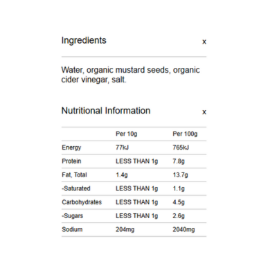 {"id":9486875722024,"title":"Spiral Foods Mustard - Dijon Organic 200g","handle":"spiral-foods-mustard-dijon-organic-200g","description":"\u003cp\u003e \u003c\/p\u003e\n\u003ch5\u003eReviews\u003c\/h5\u003e\n\u003cp\u003eReviews go here\u003c\/p\u003e\n\u003ch5\u003eIngredients\u003c\/h5\u003e\n\u003cp\u003eAny images, tags, filters, product categories, and any other information on this website showing ingredients, nutrition panels, or allergy statements are for guidance only, as manufacturers often change their formulations without notice. Please contact the manufacturer for the most up-to-date ingredient information, or email us to confirm the ingredients of the stock currently on hand.\u003c\/p\u003e","published_at":"2025-11-19T11:22:04+11:00","created_at":"2024-11-07T16:18:47+11:00","vendor":"Spiral Foods","type":"General","tags":["Cooking Pastes","Savoury Sauces","Sydney Store"],"price":648,"price_min":648,"price_max":648,"available":true,"price_varies":false,"compare_at_price":null,"compare_at_price_min":0,"compare_at_price_max":0,"compare_at_price_varies":false,"variants":[{"id":49487043854632,"title":"Default Title","option1":"Default Title","option2":null,"option3":null,"sku":"9312336763001","requires_shipping":true,"taxable":false,"featured_image":null,"available":true,"name":"Spiral Foods Mustard - Dijon Organic 200g","public_title":null,"options":["Default Title"],"price":648,"weight":0,"compare_at_price":null,"inventory_quantity":4,"inventory_management":"shopify","inventory_policy":"deny","barcode":null,"requires_selling_plan":false,"selling_plan_allocations":[]}],"images":["\/\/crueltyfreeshop.myshopify.com\/cdn\/shop\/files\/Spiral_Medit_MustardDijon_1.jpg?v=1730956727","\/\/crueltyfreeshop.myshopify.com\/cdn\/shop\/files\/SpiralDijon-NutritionalInformation.png?v=1764551149"],"featured_image":"\/\/crueltyfreeshop.myshopify.com\/cdn\/shop\/files\/Spiral_Medit_MustardDijon_1.jpg?v=1730956727","options":["Title"],"media":[{"alt":null,"id":40433869160744,"position":1,"preview_image":{"aspect_ratio":1.0,"height":2000,"width":2000,"src":"\/\/crueltyfreeshop.myshopify.com\/cdn\/shop\/files\/Spiral_Medit_MustardDijon_1.jpg?v=1730956727"},"aspect_ratio":1.0,"height":2000,"media_type":"image","src":"\/\/crueltyfreeshop.myshopify.com\/cdn\/shop\/files\/Spiral_Medit_MustardDijon_1.jpg?v=1730956727","width":2000},{"alt":null,"id":43111955693864,"position":2,"preview_image":{"aspect_ratio":1.0,"height":400,"width":400,"src":"\/\/crueltyfreeshop.myshopify.com\/cdn\/shop\/files\/SpiralDijon-NutritionalInformation.png?v=1764551149"},"aspect_ratio":1.0,"height":400,"media_type":"image","src":"\/\/crueltyfreeshop.myshopify.com\/cdn\/shop\/files\/SpiralDijon-NutritionalInformation.png?v=1764551149","width":400}],"requires_selling_plan":false,"selling_plan_groups":[],"content":"\u003cp\u003e \u003c\/p\u003e\n\u003ch5\u003eReviews\u003c\/h5\u003e\n\u003cp\u003eReviews go here\u003c\/p\u003e\n\u003ch5\u003eIngredients\u003c\/h5\u003e\n\u003cp\u003eAny images, tags, filters, product categories, and any other information on this website showing ingredients, nutrition panels, or allergy statements are for guidance only, as manufacturers often change their formulations without notice. Please contact the manufacturer for the most up-to-date ingredient information, or email us to confirm the ingredients of the stock currently on hand.\u003c\/p\u003e"}
