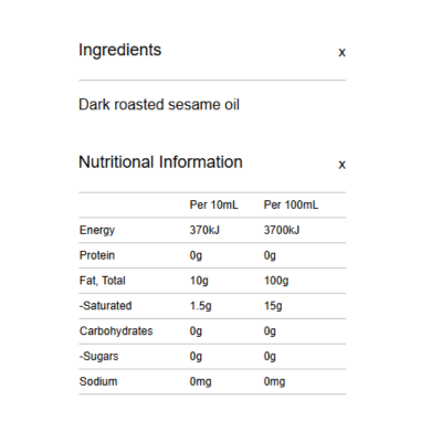{"id":9488117039400,"title":"Spiral Foods Oil - Japanese Dark Sesame 250ml","handle":"spiral-foods-oil-japanese-dark-sesame-250ml","description":"\u003cp\u003e \u003c\/p\u003e\n\u003ch5\u003eReviews\u003c\/h5\u003e\n\u003cp\u003eReviews go here\u003c\/p\u003e\n\u003ch5\u003eIngredients\u003c\/h5\u003e\n\u003cp\u003eAny images, tags, filters, product categories, and any other information on this website showing ingredients, nutrition panels, or allergy statements are for guidance only, as manufacturers often change their formulations without notice. Please contact the manufacturer for the most up-to-date ingredient information, or email us to confirm the ingredients of the stock currently on hand.\u003c\/p\u003e","published_at":"2025-09-15T16:34:46+10:00","created_at":"2024-11-08T10:32:38+11:00","vendor":"Spiral Foods","type":"General","tags":["Dressings","Oil","Sydney Store"],"price":1080,"price_min":1080,"price_max":1080,"available":true,"price_varies":false,"compare_at_price":null,"compare_at_price_min":0,"compare_at_price_max":0,"compare_at_price_varies":false,"variants":[{"id":49490870698280,"title":"Default Title","option1":"Default Title","option2":null,"option3":null,"sku":"9312336140000","requires_shipping":true,"taxable":false,"featured_image":null,"available":true,"name":"Spiral Foods Oil - Japanese Dark Sesame 250ml","public_title":null,"options":["Default Title"],"price":1080,"weight":0,"compare_at_price":null,"inventory_quantity":3,"inventory_management":"shopify","inventory_policy":"deny","barcode":null,"requires_selling_plan":false,"selling_plan_allocations":[]}],"images":["\/\/crueltyfreeshop.myshopify.com\/cdn\/shop\/files\/Spiral_Sauc_SesameOil_1.jpg?v=1731022358","\/\/crueltyfreeshop.myshopify.com\/cdn\/shop\/files\/SpiralSesameoil-NutritionalInformation.png?v=1764551175"],"featured_image":"\/\/crueltyfreeshop.myshopify.com\/cdn\/shop\/files\/Spiral_Sauc_SesameOil_1.jpg?v=1731022358","options":["Title"],"media":[{"alt":null,"id":40440111235368,"position":1,"preview_image":{"aspect_ratio":1.0,"height":2000,"width":2000,"src":"\/\/crueltyfreeshop.myshopify.com\/cdn\/shop\/files\/Spiral_Sauc_SesameOil_1.jpg?v=1731022358"},"aspect_ratio":1.0,"height":2000,"media_type":"image","src":"\/\/crueltyfreeshop.myshopify.com\/cdn\/shop\/files\/Spiral_Sauc_SesameOil_1.jpg?v=1731022358","width":2000},{"alt":null,"id":43111958282536,"position":2,"preview_image":{"aspect_ratio":1.0,"height":400,"width":400,"src":"\/\/crueltyfreeshop.myshopify.com\/cdn\/shop\/files\/SpiralSesameoil-NutritionalInformation.png?v=1764551175"},"aspect_ratio":1.0,"height":400,"media_type":"image","src":"\/\/crueltyfreeshop.myshopify.com\/cdn\/shop\/files\/SpiralSesameoil-NutritionalInformation.png?v=1764551175","width":400}],"requires_selling_plan":false,"selling_plan_groups":[],"content":"\u003cp\u003e \u003c\/p\u003e\n\u003ch5\u003eReviews\u003c\/h5\u003e\n\u003cp\u003eReviews go here\u003c\/p\u003e\n\u003ch5\u003eIngredients\u003c\/h5\u003e\n\u003cp\u003eAny images, tags, filters, product categories, and any other information on this website showing ingredients, nutrition panels, or allergy statements are for guidance only, as manufacturers often change their formulations without notice. Please contact the manufacturer for the most up-to-date ingredient information, or email us to confirm the ingredients of the stock currently on hand.\u003c\/p\u003e"}