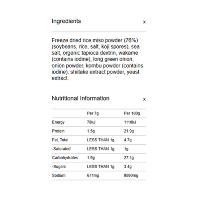 {"id":9486879981864,"title":"Spiral Foods Soup - Instant Miso Soup White (5pk x 7g)","handle":"spiral-foods-soup-instant-miso-soup-white-5pk-x-7g","description":"\u003cp\u003e \u003c\/p\u003e\n\u003ch5\u003eReviews\u003c\/h5\u003e\n\u003cp\u003eReviews go here\u003c\/p\u003e\n\u003ch5\u003eIngredients\u003c\/h5\u003e\n\u003cp\u003eAny images, tags, filters, product categories, and any other information on this website showing ingredients, nutrition panels, or allergy statements are for guidance only, as manufacturers often change their formulations without notice. Please contact the manufacturer for the most up-to-date ingredient information, or email us to confirm the ingredients of the stock currently on hand.\u003c\/p\u003e","published_at":"2025-03-05T12:37:38+11:00","created_at":"2024-11-07T16:59:58+11:00","vendor":"Spiral Foods","type":"General","tags":["Instant Meals","Soups","Sydney Store"],"price":733,"price_min":733,"price_max":733,"available":true,"price_varies":false,"compare_at_price":null,"compare_at_price_min":0,"compare_at_price_max":0,"compare_at_price_varies":false,"variants":[{"id":49487105425704,"title":"Default Title","option1":"Default Title","option2":null,"option3":null,"sku":"9312336039601","requires_shipping":true,"taxable":false,"featured_image":null,"available":true,"name":"Spiral Foods Soup - Instant Miso Soup White (5pk x 7g)","public_title":null,"options":["Default Title"],"price":733,"weight":0,"compare_at_price":null,"inventory_quantity":3,"inventory_management":"shopify","inventory_policy":"deny","barcode":null,"requires_selling_plan":false,"selling_plan_allocations":[]}],"images":["\/\/crueltyfreeshop.myshopify.com\/cdn\/shop\/files\/Spiral_Miso_InstantWhite5_1.jpg?v=1730959198","\/\/crueltyfreeshop.myshopify.com\/cdn\/shop\/files\/SpiralInstantWhiteMisoSoup-NutritionalInformation.png?v=1764551139"],"featured_image":"\/\/crueltyfreeshop.myshopify.com\/cdn\/shop\/files\/Spiral_Miso_InstantWhite5_1.jpg?v=1730959198","options":["Title"],"media":[{"alt":null,"id":40433985519912,"position":1,"preview_image":{"aspect_ratio":1.0,"height":2000,"width":2000,"src":"\/\/crueltyfreeshop.myshopify.com\/cdn\/shop\/files\/Spiral_Miso_InstantWhite5_1.jpg?v=1730959198"},"aspect_ratio":1.0,"height":2000,"media_type":"image","src":"\/\/crueltyfreeshop.myshopify.com\/cdn\/shop\/files\/Spiral_Miso_InstantWhite5_1.jpg?v=1730959198","width":2000},{"alt":null,"id":43111955431720,"position":2,"preview_image":{"aspect_ratio":1.0,"height":400,"width":400,"src":"\/\/crueltyfreeshop.myshopify.com\/cdn\/shop\/files\/SpiralInstantWhiteMisoSoup-NutritionalInformation.png?v=1764551139"},"aspect_ratio":1.0,"height":400,"media_type":"image","src":"\/\/crueltyfreeshop.myshopify.com\/cdn\/shop\/files\/SpiralInstantWhiteMisoSoup-NutritionalInformation.png?v=1764551139","width":400}],"requires_selling_plan":false,"selling_plan_groups":[],"content":"\u003cp\u003e \u003c\/p\u003e\n\u003ch5\u003eReviews\u003c\/h5\u003e\n\u003cp\u003eReviews go here\u003c\/p\u003e\n\u003ch5\u003eIngredients\u003c\/h5\u003e\n\u003cp\u003eAny images, tags, filters, product categories, and any other information on this website showing ingredients, nutrition panels, or allergy statements are for guidance only, as manufacturers often change their formulations without notice. Please contact the manufacturer for the most up-to-date ingredient information, or email us to confirm the ingredients of the stock currently on hand.\u003c\/p\u003e"}