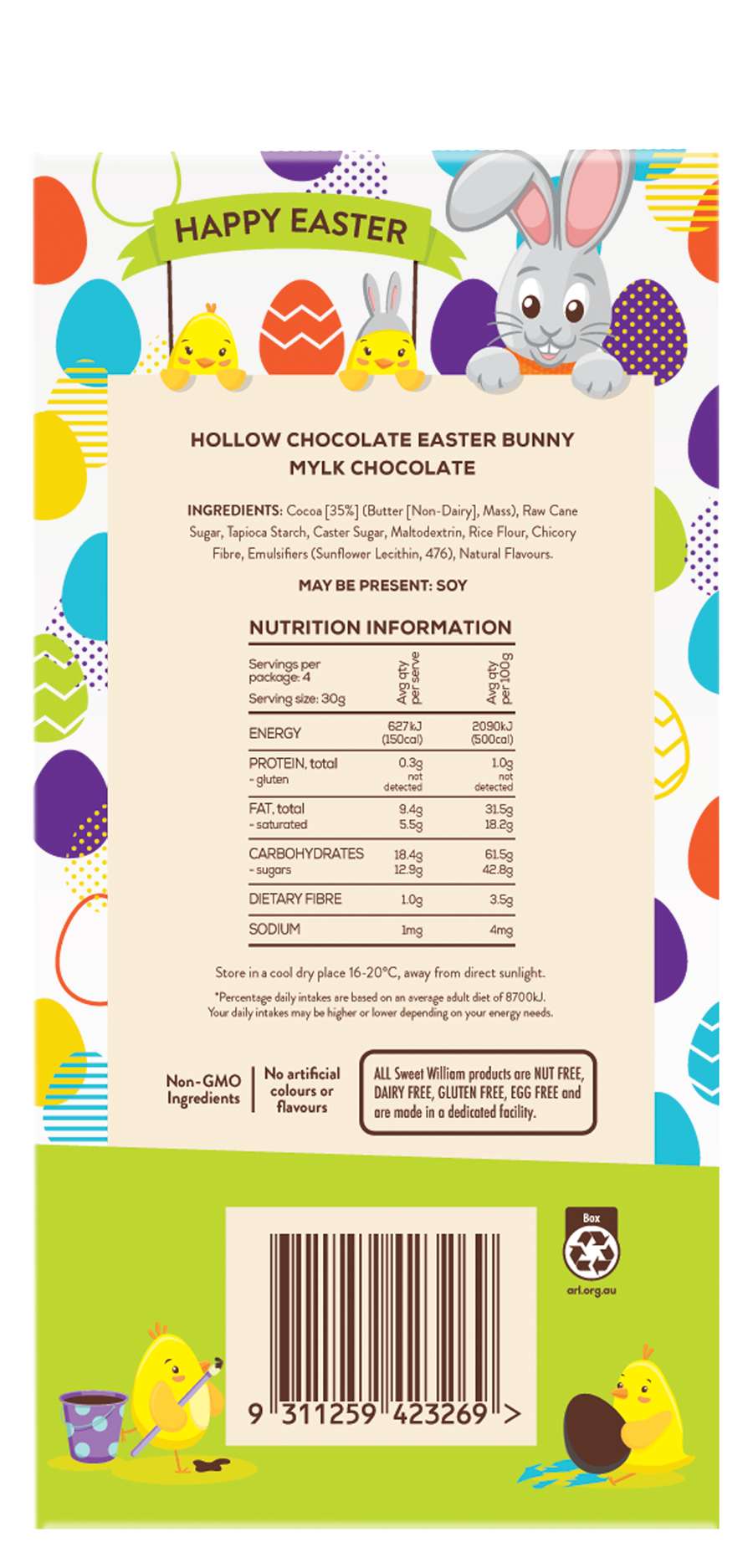 120g. Ingredients: Cocoa [35%] (Butter [Non-Dairy], Mass), Raw Cane Sugar, Tapioca Starch, Caster Sugar, Maltodextrin, Rice Flour, Chicory Fibre, Emulsifiers (Sunflower Lecithin, 476), Natural Flavours.
