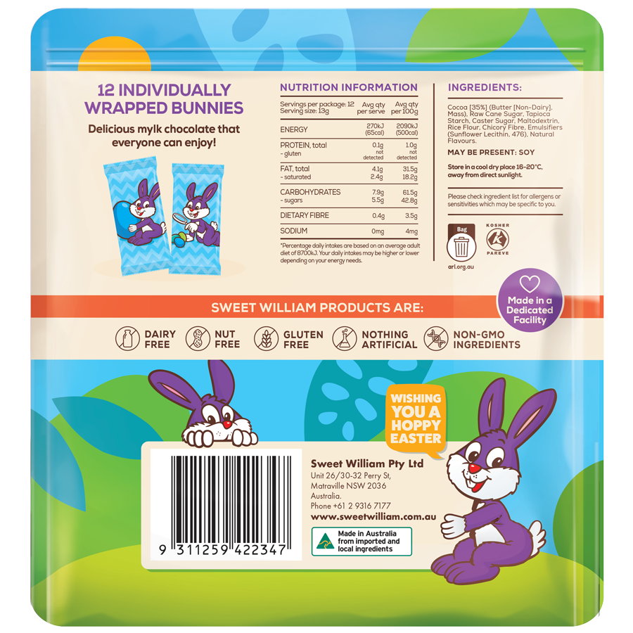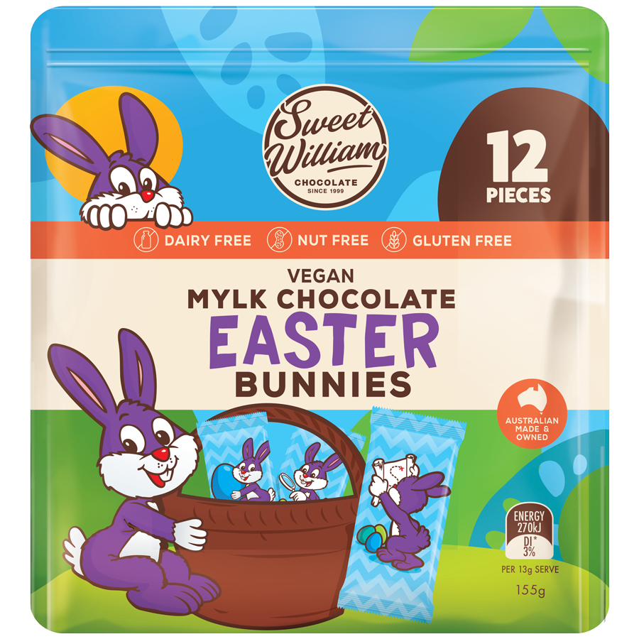 The original, classic Sweet William chocolate, smooth and chocolatey, poured into the shape of a mini Easter Bunny! Each Easter Multipack contains 12 individually wrapped Bunny chocolates. Perfect for Easter treasure hunts.