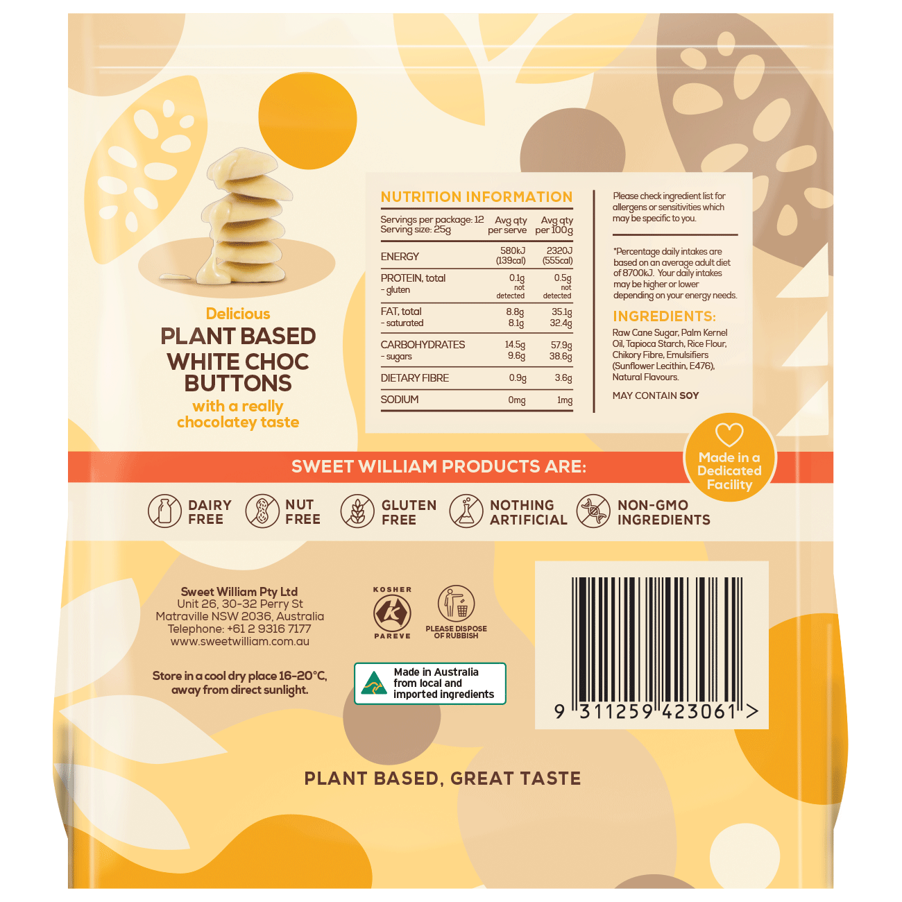 {"id":8463415181,"title":"Sweet William White Baking Buttons 300g (cold)","handle":"sweet-william-white-chocolate-baking-buttons-300g","description":"\u003cp\u003e\u003cspan style=\"color: #333333; font-family: Arial, Helvetica, sans-serif; font-size: 14px; font-weight: bold;\"\u003e\u003c\/span\u003eDream up a sweet new recipe for these babies, they are delish! Sweet William white choc buttons are ideal for melting and can work their way into any recipe.\u003c\/p\u003e\n\u003c!-- TABS --\u003e\n\u003ch5\u003eReviews\u003c\/h5\u003e\n\u003cp\u003eReviews go here\u003c\/p\u003e\n\u003ch5\u003eIngredients\u003c\/h5\u003e\n\u003cp\u003eAny images, tags, filters, product categories, and any other information on this website showing ingredients, nutrition panels, or allergy statements are for guidance only, as manufacturers often change their formulations without notice. Please contact the manufacturer for the most up-to-date ingredient information, or email us to confirm the ingredients of the stock currently on hand.\u003c\/p\u003e\n\u003ch5\u003eImportant Shipping Note\u003c\/h5\u003e\n\u003cdiv\u003e\n\u003cspan\u003eAll orders containing chilled products, frozen products and chocolates must include a Cooler to protect them in transit. The\u003c\/span\u003e\u003cspan\u003e \u003c\/span\u003e\u003cspan\u003eCooler\u003c\/span\u003e\u003cspan\u003e will automatically add to your order when a cold product is added to your shopping cart. \u003c\/span\u003e\u003cspan\u003eFrozen items may defrost in transit, we can not recommend re-freezing. \u003c\/span\u003e\u003cspan\u003eWe will select the correct size cooler for your order. Chilled orders can only be sent to certain areas, please refer to our \u003c\/span\u003e\u003ca href=\"https:\/\/www.crueltyfreeshop.com.au\/pages\/faq#refrid\" rel=\"noopener\" data-saferedirecturl=\"https:\/\/www.google.com\/url?q=https:\/\/www.crueltyfreeshop.com.au\/pages\/faq%23refrid\u0026amp;source=gmail\u0026amp;ust=1664430462005000\u0026amp;usg=AOvVaw3YpBIvhTwoxQRA_PVqbP_L\" target=\"_blank\"\u003eFAQ\u003c\/a\u003e\u003cspan\u003e or email us at \u003c\/span\u003e\u003ca href=\"mailto:online@vegangrocerystore.com.au\" rel=\"noopener\" target=\"_blank\"\u003eonline@vegangrocerystore.\u003cwbr\u003ecom.au\u003c\/wbr\u003e\u003c\/a\u003e\n\u003c\/div\u003e\n\u003c!-- \/TABS --\u003e","published_at":"2025-11-19T11:21:12+11:00","created_at":"2016-11-20T13:46:25+11:00","vendor":"Sweet William","type":"Food (GST Free)","tags":["Baking","Chocolate","Sydney Store"],"price":850,"price_min":850,"price_max":850,"available":true,"price_varies":false,"compare_at_price":null,"compare_at_price_min":0,"compare_at_price_max":0,"compare_at_price_varies":false,"variants":[{"id":28595330765,"title":"Default Title","option1":"Default Title","option2":null,"option3":null,"sku":"9311259423061","requires_shipping":true,"taxable":false,"featured_image":null,"available":true,"name":"Sweet William White Baking Buttons 300g (cold)","public_title":null,"options":["Default Title"],"price":850,"weight":300,"compare_at_price":null,"inventory_quantity":4,"inventory_management":"shopify","inventory_policy":"deny","barcode":"","requires_selling_plan":false,"selling_plan_allocations":[]}],"images":["\/\/crueltyfreeshop.myshopify.com\/cdn\/shop\/files\/SWLM1130R.jpg?v=1764736008","\/\/crueltyfreeshop.myshopify.com\/cdn\/shop\/files\/WhiteBakingButtons300gBack.png?v=1764736008","\/\/crueltyfreeshop.myshopify.com\/cdn\/shop\/products\/product-graphics11.png?v=1764736008"],"featured_image":"\/\/crueltyfreeshop.myshopify.com\/cdn\/shop\/files\/SWLM1130R.jpg?v=1764736008","options":["Title"],"media":[{"alt":null,"id":43122387091752,"position":1,"preview_image":{"aspect_ratio":1.0,"height":700,"width":700,"src":"\/\/crueltyfreeshop.myshopify.com\/cdn\/shop\/files\/SWLM1130R.jpg?v=1764736008"},"aspect_ratio":1.0,"height":700,"media_type":"image","src":"\/\/crueltyfreeshop.myshopify.com\/cdn\/shop\/files\/SWLM1130R.jpg?v=1764736008","width":700},{"alt":null,"id":37835021156648,"position":2,"preview_image":{"aspect_ratio":1.0,"height":1300,"width":1300,"src":"\/\/crueltyfreeshop.myshopify.com\/cdn\/shop\/files\/WhiteBakingButtons300gBack.png?v=1764736008"},"aspect_ratio":1.0,"height":1300,"media_type":"image","src":"\/\/crueltyfreeshop.myshopify.com\/cdn\/shop\/files\/WhiteBakingButtons300gBack.png?v=1764736008","width":1300},{"alt":null,"id":22227367592093,"position":3,"preview_image":{"aspect_ratio":0.685,"height":1012,"width":693,"src":"\/\/crueltyfreeshop.myshopify.com\/cdn\/shop\/products\/product-graphics11.png?v=1764736008"},"aspect_ratio":0.685,"height":1012,"media_type":"image","src":"\/\/crueltyfreeshop.myshopify.com\/cdn\/shop\/products\/product-graphics11.png?v=1764736008","width":693}],"requires_selling_plan":false,"selling_plan_groups":[],"content":"\u003cp\u003e\u003cspan style=\"color: #333333; font-family: Arial, Helvetica, sans-serif; font-size: 14px; font-weight: bold;\"\u003e\u003c\/span\u003eDream up a sweet new recipe for these babies, they are delish! Sweet William white choc buttons are ideal for melting and can work their way into any recipe.\u003c\/p\u003e\n\u003c!-- TABS --\u003e\n\u003ch5\u003eReviews\u003c\/h5\u003e\n\u003cp\u003eReviews go here\u003c\/p\u003e\n\u003ch5\u003eIngredients\u003c\/h5\u003e\n\u003cp\u003eAny images, tags, filters, product categories, and any other information on this website showing ingredients, nutrition panels, or allergy statements are for guidance only, as manufacturers often change their formulations without notice. Please contact the manufacturer for the most up-to-date ingredient information, or email us to confirm the ingredients of the stock currently on hand.\u003c\/p\u003e\n\u003ch5\u003eImportant Shipping Note\u003c\/h5\u003e\n\u003cdiv\u003e\n\u003cspan\u003eAll orders containing chilled products, frozen products and chocolates must include a Cooler to protect them in transit. The\u003c\/span\u003e\u003cspan\u003e \u003c\/span\u003e\u0