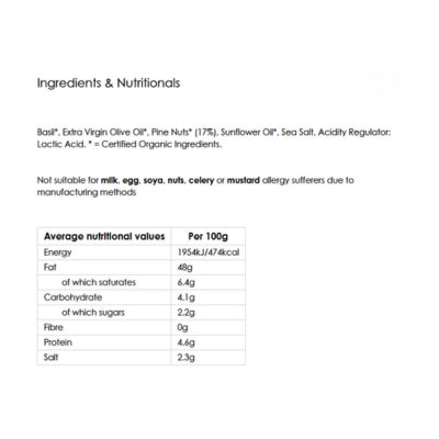 {"id":9802708123944,"title":"Biona Green Pesto 120g","handle":"tbdbionagreenpesto120g","description":"\u003cp\u003eMamma mia! Every kitchen needs this-a pesto. Super tasty organic green pesto, made with pine kernels, is perfect added to pasta or as a bruschetta spread onto bread. With no added parmesan cheese, this pesto is perfecto for vegans too.\u003c\/p\u003e\n\u003cp\u003eBiona Organic believe in great tasting, thoughtfully prepared food to complement a healthy and ethical lifestyle. Their farmers and producers don't use chemical pesticides or herbicides, they don't grow genetically modified plants or use nasty preservatives and additives. \u003cbr\u003e\u003cbr\u003eBiona also make sure they only use sustainable farming methods and do not work their land intensively. And because they believe in 100% traceability, Biona know where all their ingredients come from, that they are of the highest quality and taste, completely natural.\u003c\/p\u003e\n\u003ch5\u003eReviews\u003c\/h5\u003e\n\u003cp\u003eReviews go here\u003c\/p\u003e\n\u003ch5\u003eIngredients\u003c\/h5\u003e\n\u003cp\u003eAny images, tags, filters, product categories, and any other information on this website showing ingredients, nutrition panels, or allergy statements are for guidance only, as manufacturers often change their formulations without notice. Please contact the manufacturer for the most up-to-date ingredient information, or email us to confirm the ingredients of the stock currently on hand.\u003c\/p\u003e","published_at":"2025-09-15T16:16:31+10:00","created_at":"2025-09-15T16:16:30+10:00","vendor":"Biona","type":"Food (GST Free)","tags":["Pesto","Sydney Store"],"price":1291,"price_min":1291,"price_max":1291,"available":true,"price_varies":false,"compare_at_price":null,"compare_at_price_min":0,"compare_at_price_max":0,"compare_at_price_varies":false,"variants":[{"id":50644399554856,"title":"Default Title","option1":"Default Title","option2":null,"option3":null,"sku":"5032722302075","requires_shipping":true,"taxable":false,"featured_image":null,"available":true,"name":"Biona Green Pesto 120g","public_title":null,"options":["Default Title"],"price":1291,"weight":0,"compare_at_price":null,"inventory_quantity":3,"inventory_management":"shopify","inventory_policy":"deny","barcode":null,"requires_selling_plan":false,"selling_plan_allocations":[]}],"images":["\/\/crueltyfreeshop.myshopify.com\/cdn\/shop\/files\/BionaGreenPesto120g.png?v=1763791303","\/\/crueltyfreeshop.myshopify.com\/cdn\/shop\/files\/BionaPesto-NutritionalInformation.jpg?v=1764804547"],"featured_image":"\/\/crueltyfreeshop.myshopify.com\/cdn\/shop\/files\/BionaGreenPesto120g.png?v=1763791303","options":["Title"],"media":[{"alt":null,"id":43028771635496,"position":1,"preview_image":{"aspect_ratio":1.0,"height":400,"width":400,"src":"\/\/crueltyfreeshop.myshopify.com\/cdn\/shop\/files\/BionaGreenPesto120g.png?v=1763791303"},"aspect_ratio":1.0,"height":400,"media_type":"image","src":"\/\/crueltyfreeshop.myshopify.com\/cdn\/shop\/files\/BionaGreenPesto120g.png?v=1763791303","width":400},{"alt":null,"id":43126980182312,"position":2,"preview_image":{"aspect_ratio":1.0,"height":400,"width":400,"src":"\/\/crueltyfreeshop.myshopify.com\/cdn\/shop\/files\/BionaPesto-NutritionalInformation.jpg?v=1764804547"},"aspect_ratio":1.0,"height":400,"media_type":"image","src":"\/\/crueltyfreeshop.myshopify.com\/cdn\/shop\/files\/BionaPesto-NutritionalInformation.jpg?v=1764804547","width":400}],"requires_selling_plan":false,"selling_plan_groups":[],"content":"\u003cp\u003eMamma mia! Every kitchen needs this-a pesto. Super tasty organic green pesto, made with pine kernels, is perfect added to pasta or as a bruschetta spread onto bread. With no added parmesan cheese, this pesto is perfecto for vegans too.\u003c\/p\u003e\n\u003cp\u003eBiona Organic believe in great tasting, thoughtfully prepared food to complement a healthy and ethical lifestyle. Their farmers and producers don't use chemical pesticides or herbicides, they don't grow genetically modified plants or use nasty preservatives and additives. \u003cbr\u003e\u003cbr\u003eBiona also make sure they only use sustainable farming methods and do not work their land intensively. And because they believe in 100% traceability, Biona know where all their ingredients come from, that they are of the highest quality and taste, completely natural.\u003c\/p\u003e\n\u003ch5\u003eReviews\u003c\/h5\u003e\n\u003cp\u003eReviews go here\u003c\/p\u003e\n\u003ch5\u003eIngredients\u003c\/h5\u003e\n\u003cp\u003eAny images, tags, filters, product categories, and any other information on this website showing ingredients, nutrition panels, or allergy statements are for guidance only, as manufacturers often change their formulations without notice. Please contact the manufacturer for the most up-to-date ingredient information, or email us to confirm the ingredients of the stock currently on hand.\u003c\/p\u003e"}
