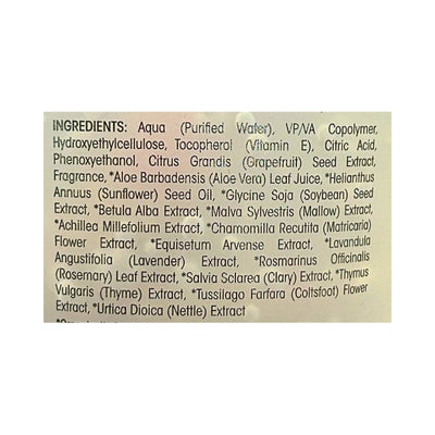 200ml. Ingredients: Aqua (Purified Water), VP/VA Copolymer, Hydroxyethylcellulose, Tocopherol (Vitamin E), Citric Acid, Phenoxyethanol, Citrus Grandis (Grapefruit) Seed Extract, Fragrance (Includes Essential Oils), *Aloe Barbadensis (Aloe Vera) Leaf Juice, *Helianthus Annuus (Sunflower) Seed Oil, *Glycine Soja (Soybean) Seed Extract, *Betula Alba Extract, *Malva Sylvestris (Mallow) Extract, *Achillea Millefolium Extract, *Chamomilla Recutita (Matricaria) Flower Extract, *Equisetum Arvense Extract, *Lavandula Angustifolia (Lavender) Extract, *Rosmarinus Officinalis (Rosemary) Leaf Extract, *Salvia Sclarea (Clary) Extract, *Thymus Vulgaris (Thyme) Extract, *Tussilago Farfara (Coltsfoot) Flower Extract, *Urtica Dioica (Nettle) Extract. *USDA Certified Organic