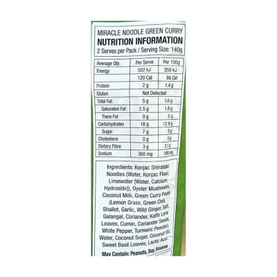 280g. Ingredients: Konjac Shirataki Noodles (Water, Konjac Flour, Limewater (Calcium Hydroxide)), Oyster Mushroom, Coconut Milk, Green Curry Paste (Lemon Grass, Green Chilli, Shallot, Garlic, Wild Ginger, Salt, Galangal, Coriander, Kaffir Lime Leaves, Cumin, Coriander Seeds, White Pepper), Water, Coconut Sugar, Coconut Oil, Sweet Basil Leaves, Lactic Acid