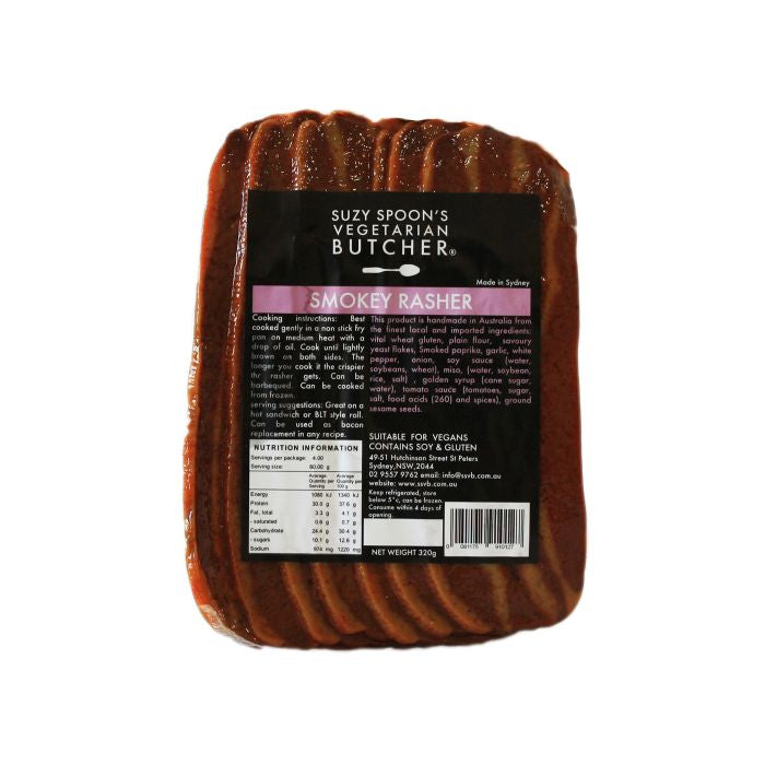 {"id":9848479023400,"title":"Suzy Spoons Smokey Rashers -320g (cold)","handle":"tbdsuzyspoonssmokeyrashers-320gcold","description":"\u003cp\u003e7 Slices per pack\u003c\/p\u003e\n\u003cp\u003eThese Smokey Rashers are great on a hot sandwich or BLT style roll, add to your favourite pasta dish, pies or just cook up for breakfast. Can be used as bacon replacement in any recipe.\u003c\/p\u003e\n\u003ch5\u003eReviews\u003c\/h5\u003e\n\u003cp\u003eReviews go here\u003c\/p\u003e\n\u003ch5\u003eIngredients\u003c\/h5\u003e\n\u003cp\u003eAny images, tags, filters, product categories, and any other information on this website showing ingredients, nutrition panels, or allergy statements are for guidance only, as manufacturers often change their formulations without notice. Please contact the manufacturer for the most up-to-date ingredient information, or email us to confirm the ingredients of the stock currently on hand.\u003c\/p\u003e\n\u003ch5\u003eImportant Shipping Note\u003c\/h5\u003e\n\u003cdiv\u003e\n\u003cspan\u003eAll orders containing chilled products, frozen products and chocolates must include a Cooler to protect them in transit. The\u003c\/span\u003e\u003cspan\u003e \u003c\/span\u003e\u003cspan\u003eCooler\u003c\/span\u003e\u003cspan\u003e will automatically add to your order when a cold product is added to your shopping cart. \u003c\/span\u003e\u003cspan\u003eFrozen items may defrost in transit, we can not recommend re-freezing. \u003c\/span\u003e\u003cspan\u003eWe will select the correct size cooler for your order. Chilled orders can only be sent to certain areas, please refer to our \u003c\/span\u003e\u003ca href=\"https:\/\/www.crueltyfreeshop.com.au\/pages\/faq#refrid\" rel=\"noopener\" target=\"_blank\" data-saferedirecturl=\"https:\/\/www.google.com\/url?q=https:\/\/www.crueltyfreeshop.com.au\/pages\/faq%23refrid\u0026amp;source=gmail\u0026amp;ust=1664430462005000\u0026amp;usg=AOvVaw3YpBIvhTwoxQRA_PVqbP_L\"\u003eFAQ\u003c\/a\u003e\u003cspan\u003e or email us at \u003c\/span\u003e\u003ca href=\"mailto:online@vegangrocerystore.com.au\" rel=\"noopener\" target=\"_blank\"\u003eonline@vegangrocerystore.\u003cwbr\u003ecom.au\u003c\/wbr\u003e\u003c\/a\u003e\n\u003c\/div\u003e","published_at":"2026-02-06T12:25:24+11:00","created_at":"2025-10-13T13:54:53+11:00","vendor":"Suzy Spoons","type":"Refrig food (GST Free)","tags":["Bacon","Sydney Store"],"price":1435,"price_min":1435,"price_max":1435,"available":true,"price_varies":false,"compare_at_price":null,"compare_at_price_min":0,"compare_at_price_max":0,"compare_at_price_varies":false,"variants":[{"id":50826292855080,"title":"Default Title","option1":"Default Title","option2":null,"option3":null,"sku":"081175910127","requires_shipping":true,"taxable":false,"featured_image":null,"available":true,"name":"Suzy Spoons Smokey Rashers -320g (cold)","public_title":null,"options":["Default Title"],"price":1435,"weight":320,"compare_at_price":null,"inventory_quantity":4,"inventory_management":"shopify","inventory_policy":"deny","barcode":null,"requires_selling_plan":false,"selling_plan_allocations":[]}],"images":["\/\/crueltyfreeshop.myshopify.com\/cdn\/shop\/files\/SZSP1100R.jpg?v=1765854666"],"featured_image":"\/\/crueltyfreeshop.myshopify.com\/cdn\/shop\/files\/SZSP1100R.jpg?v=1765854666","options":["Title"],"media":[{"alt":null,"id":43185920016680,"position":1,"preview_image":{"aspect_ratio":1.0,"height":700,"width":700,"src":"\/\/crueltyfreeshop.myshopify.com\/cdn\/shop\/files\/SZSP1100R.jpg?v=1765854666"},"aspect_ratio":1.0,"height":700,"media_type":"image","src":"\/\/crueltyfreeshop.myshopify.com\/cdn\/shop\/files\/SZSP1100R.jpg?v=1765854666","width":700}],"requires_selling_plan":false,"selling_plan_groups":[],"content":"\u003cp\u003e7 Slices per pack\u003c\/p\u003e\n\u003cp\u003eThese Smokey Rashers are great on a hot sandwich or BLT style roll, add to your favourite pasta dish, pies or just cook up for breakfast. Can be used as bacon replacement in any recipe.\u003c\/p\u003e\n\u003ch5\u003eReviews\u003c\/h5\u003e\n\u003cp\u003eReviews go here\u003c\/p\u003e\n\u003ch5\u003eIngredients\u003c\/h5\u003e\n\u003cp\u003eAny images, tags, filters, product categories, and any other information on this website showing ingredients, nutrition panels, or allergy statements are for guidance only, as manufacturers often change their formulations without notice. Please contact the manufacturer for the most up-to-date ingredient information, or email us to confirm the ingredients of the stock currently on hand.\u003c\/p\u003e\n\u003ch5\u003eImportant Shipping Note\u003c\/h5\u003e\n\u003cdiv\u003e\n\u003cspan\u003eAll orders containing chilled products, frozen products and chocolates must include a Cooler to protect them in transit. The\u003c\/span\u003e\u003cspan\u003e \u003c\/span\u003e\u003cspan\u003eCooler\u003c\/span\u003e\u003cspan\u003e will automatically add to your order when a cold product is added to your shopping cart. \u003c\/span\u003e\u003cspan\u003eFrozen items may defrost in transit, we can not recommend re-freezing. \u003c\/span\u003e\u003cspan\u003eWe will select the correct size cooler for your order. Chilled orders can only be sent to certain areas, please refer to our \u003c\/span\u003e\u003ca href=\"https:\/\/www.crueltyfreeshop.com.au\/pages\/faq#refrid\" rel=\"noopener\" target=\"_blank\" data-saferedirecturl=\"https:\/\/www.google.com\/url?q=https:\/\/www.crueltyfreeshop.com.au\/pages\/faq%23refrid\u0026amp;source=gmail\u0026amp;ust=1664430462005000\u0026amp;usg=AOvVaw3YpBIvhTwoxQRA_PVqbP_L\"\u003eFAQ\u003c\/a\u003e\u003cspan\u003e or email us at \u003c\/span\u003e\u003ca href=\"mailto:online@vegangrocerystore.com.au\" rel=\"noopener\" target=\"_blank\"\u003eonline@vegangrocerystore.\u003cwbr\u003ecom.au\u003c\/wbr\u003e\u003c\/a\u003e\n\u003c\/div\u003e"}