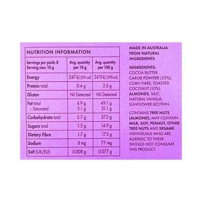 {"id":9701086855464,"title":"The Carob Kitchen Carob Bar Vegan Coconut 80g (cold)","handle":"the-carob-kitchen-carob-bar-vegan-coconut-80g","description":"\u003cp\u003e \u003c\/p\u003e\n\u003ch5\u003eReviews\u003c\/h5\u003e\n\u003cp\u003eReviews go here\u003c\/p\u003e\n\u003ch5\u003eIngredients\u003c\/h5\u003e\n\u003cp\u003eAny images, tags, filters, product categories, and any other information on this website showing ingredients, nutrition panels, or allergy statements are for guidance only, as manufacturers often change their formulations without notice. Please contact the manufacturer for the most up-to-date ingredient information, or email us to confirm the ingredients of the stock currently on hand.\u003c\/p\u003e\n\u003ch5\u003eImportant Shipping Note\u003c\/h5\u003e\n\u003cdiv\u003e\n\u003cspan\u003eAll orders containing chilled products, frozen products and chocolates must include a Cooler to protect them in transit. The\u003c\/span\u003e\u003cspan\u003e \u003c\/span\u003e\u003cspan\u003eCooler\u003c\/span\u003e\u003cspan\u003e will automatically add to your order when a cold product is added to your shopping cart. \u003c\/span\u003e\u003cspan\u003eFrozen items may defrost in transit, we can not recommend re-freezing. \u003c\/span\u003e\u003cspan\u003eWe will select the correct size cooler for your order. Chilled orders can only be sent to certain areas, please refer to our \u003c\/span\u003e\u003ca href=\"https:\/\/www.crueltyfreeshop.com.au\/pages\/faq#refrid\" rel=\"noopener\" target=\"_blank\" data-saferedirecturl=\"https:\/\/www.google.com\/url?q=https:\/\/www.crueltyfreeshop.com.au\/pages\/faq%23refrid\u0026amp;source=gmail\u0026amp;ust=1664430462005000\u0026amp;usg=AOvVaw3YpBIvhTwoxQRA_PVqbP_L\"\u003eFAQ\u003c\/a\u003e\u003cspan\u003e or email us at \u003c\/span\u003e\u003ca href=\"mailto:online@vegangrocerystore.com.au\" rel=\"noopener\" target=\"_blank\"\u003eonline@vegangrocerystore.\u003cwbr\u003ecom.au\u003c\/wbr\u003e\u003c\/a\u003e\n\u003c\/div\u003e","published_at":"2025-11-21T15:54:08+11:00","created_at":"2025-07-09T09:19:59+10:00","vendor":"The Carob Kitchen","type":"","tags":["Carob","Chocolate","Sydney Store"],"price":885,"price_min":885,"price_max":885,"available":true,"price_varies":false,"compare_at_price":null,"compare_at_price_min":0,"compare_at_price_max":0,"compare_at_price_varies":false,"variants":[{"id":50366120067368,"title":"Default Title","option1":"Default Title","option2":null,"option3":null,"sku":"9354396000085","requires_shipping":true,"taxable":true,"featured_image":null,"available":true,"name":"The Carob Kitchen Carob Bar Vegan Coconut 80g (cold)","public_title":null,"options":["Default Title"],"price":885,"weight":0,"compare_at_price":null,"inventory_quantity":2,"inventory_management":"shopify","inventory_policy":"deny","barcode":null,"requires_selling_plan":false,"selling_plan_allocations":[]}],"images":["\/\/crueltyfreeshop.myshopify.com\/cdn\/shop\/files\/CARB146.jpg?v=1752016802","\/\/crueltyfreeshop.myshopify.com\/cdn\/shop\/files\/carobbarcoconut-NutritionalInfo.jpg?v=1763959936"],"featured_image":"\/\/crueltyfreeshop.myshopify.com\/cdn\/shop\/files\/CARB146.jpg?v=1752016802","options":["Title"],"media":[{"alt":null,"id":41852855222568,"position":1,"preview_image":{"aspect_ratio":0.479,"height":1000,"width":479,"src":"\/\/crueltyfreeshop.myshopify.com\/cdn\/shop\/files\/CARB146.jpg?v=1752016802"},"aspect_ratio":0.479,"height":1000,"media_type":"image","src":"\/\/crueltyfreeshop.myshopify.com\/cdn\/shop\/files\/CARB146.jpg?v=1752016802","width":479},{"alt":null,"id":43044721099048,"position":2,"preview_image":{"aspect_ratio":1.0,"height":400,"width":400,"src":"\/\/crueltyfreeshop.myshopify.com\/cdn\/shop\/files\/carobbarcoconut-NutritionalInfo.jpg?v=1763959936"},"aspect_ratio":1.0,"height":400,"media_type":"image","src":"\/\/crueltyfreeshop.myshopify.com\/cdn\/shop\/files\/carobbarcoconut-NutritionalInfo.jpg?v=1763959936","width":400}],"requires_selling_plan":false,"selling_plan_groups":[],"content":"\u003cp\u003e \u003c\/p\u003e\n\u003ch5\u003eReviews\u003c\/h5\u003e\n\u003cp\u003eReviews go here\u003c\/p\u003e\n\u003ch5\u003eIngredients\u003c\/h5\u003e\n\u003cp\u003eAny images, tags, filters, product categories, and any other information on this website showing ingredients, nutrition panels, or allergy statements are for guidance only, as manufacturers often change their formulations without notice. Please contact the manufacturer for the most up-to-date ingredient information, or email us to confirm the ingredients of the stock currently on hand.\u003c\/p\u003e\n\u003ch5\u003eImportant Shipping Note\u003c\/h5\u003e\n\u003cdiv\u003e\n\u003cspan\u003eAll orders containing chilled products, frozen products and chocolates must include a Cooler to protect them in transit. The\u003c\/span\u003e\u003cspan\u003e \u003c\/span\u003e\u003cspan\u003eCooler\u003c\/span\u003e\u003cspan\u003e will automatically add to your order when a cold product is added to your shopping cart. \u003c\/span\u003e\u003cspan\u003eFrozen items may defrost in transit, we can not recommend re-freezing. \u003c\/span\u003e\u003cspan\u003eWe will select the correct size cooler for your order. Chilled orders can only be sent to certain areas, please refer to our \u003c\/span\u003e\u003ca href=\"https:\/\/www.crueltyfreeshop.com.au\/pages\/faq#refrid\" rel=\"noopener\" target=\"_blank\" data-saferedirecturl=\"https:\/\/www.google.com\/url?q=https:\/\/www.crueltyfreeshop.com.au\/pages\/faq%23refrid\u0026amp;source=gmail\u0026amp;ust=1664430462005000\u0026amp;usg=AOvVaw3YpBIvhTwoxQRA_PVqbP_L\"\u003eFAQ\u003c\/a\u003e\u003cspan\u003e or email us at \u003c\/span\u003e\u003ca href=\"mailto:online@vegangrocerystore.com.au\" rel=\"noopener\" target=\"_blank\"\u003eonline@vegangrocerystore.\u003cwbr\u003ecom.au\u003c\/wbr\u003e\u003c\/a\u003e\n\u003c\/div\u003e"}