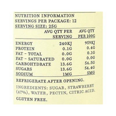 {"id":9479525630248,"title":"Yarra Valley Preserves - Jam Strawberry 300g","handle":"yarra-valley-preserves-jam-strawberry-300g","description":"\u003cp\u003e \u003c\/p\u003e\n\u003ch5\u003eReviews\u003c\/h5\u003e\n\u003cp\u003eReviews go here\u003c\/p\u003e\n\u003ch5\u003eIngredients\u003c\/h5\u003e\n\u003cp\u003eAny images, tags, filters, product categories, and any other information on this website showing ingredients, nutrition panels, or allergy statements are for guidance only, as manufacturers often change their formulations without notice. Please contact the manufacturer for the most up-to-date ingredient information, or email us to confirm the ingredients of the stock currently on hand.\u003c\/p\u003e","published_at":"2025-10-20T23:24:56+11:00","created_at":"2024-10-28T15:36:50+11:00","vendor":"Yarra Valley","type":"General","tags":["Jam","Sydney Store"],"price":1043,"price_min":1043,"price_max":1043,"available":true,"price_varies":false,"compare_at_price":null,"compare_at_price_min":0,"compare_at_price_max":0,"compare_at_price_varies":false,"variants":[{"id":49444850630952,"title":"Default Title","option1":"Default Title","option2":null,"option3":null,"sku":"9328596001975","requires_shipping":true,"taxable":false,"featured_image":null,"available":true,"name":"Yarra Valley Preserves - Jam Strawberry 300g","public_title":null,"options":["Default Title"],"price":1043,"weight":0,"compare_at_price":null,"inventory_quantity":3,"inventory_management":"shopify","inventory_policy":"deny","barcode":null,"requires_selling_plan":false,"selling_plan_allocations":[]}],"images":["\/\/crueltyfreeshop.myshopify.com\/cdn\/shop\/files\/YRGM1080R.jpg?v=1764546275","\/\/crueltyfreeshop.myshopify.com\/cdn\/shop\/files\/YarraStrawberryJam-NutritionalInformation.jpg?v=1764725991"],"featured_image":"\/\/crueltyfreeshop.myshopify.com\/cdn\/shop\/files\/YRGM1080R.jpg?v=1764546275","options":["Title"],"media":[{"alt":null,"id":43111632994600,"position":1,"preview_image":{"aspect_ratio":1.0,"height":400,"width":400,"src":"\/\/crueltyfreeshop.myshopify.com\/cdn\/shop\/files\/YRGM1080R.jpg?v=1764546275"},"aspect_ratio":1.0,"height":400,"media_type":"image","src":"\/\/crueltyfreeshop.myshopify.com\/cdn\/shop\/files\/YRGM1080R.jpg?v=1764546275","width":400},{"alt":null,"id":43121581261096,"position":2,"preview_image":{"aspect_ratio":1.0,"height":400,"width":400,"src":"\/\/crueltyfreeshop.myshopify.com\/cdn\/shop\/files\/YarraStrawberryJam-NutritionalInformation.jpg?v=1764725991"},"aspect_ratio":1.0,"height":400,"media_type":"image","src":"\/\/crueltyfreeshop.myshopify.com\/cdn\/shop\/files\/YarraStrawberryJam-NutritionalInformation.jpg?v=1764725991","width":400}],"requires_selling_plan":false,"selling_plan_groups":[],"content":"\u003cp\u003e \u003c\/p\u003e\n\u003ch5\u003eReviews\u003c\/h5\u003e\n\u003cp\u003eReviews go here\u003c\/p\u003e\n\u003ch5\u003eIngredients\u003c\/h5\u003e\n\u003cp\u003eAny images, tags, filters, product categories, and any other information on this website showing ingredients, nutrition panels, or allergy statements are for guidance only, as manufacturers often change their formulations without notice. Please contact the manufacturer for the most up-to-date ingredient information, or email us to confirm the ingredients of the stock currently on hand.\u003c\/p\u003e"}